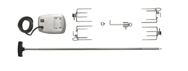Edelstahl Drehspieß (sechskantig) und Motor mit Edelstahlgehäuse.